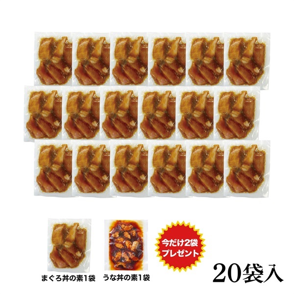 ■内容量:まぐろ丼の素75g×19袋、うな丼の素50g×1袋 ■送料:無料 ■配送方法:冷凍便(クール便)での配送になります。 ※冷凍食品です。商品到着後は速やかに冷凍庫へ入れていただき、-18度以下で保管ください。